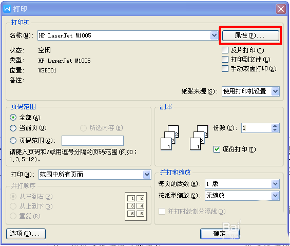 2、打印文件時怎么調整屬性?打開打印對話框,先別著急打印,右上角有一個【屬性】按鈕,我們要先設置一下。