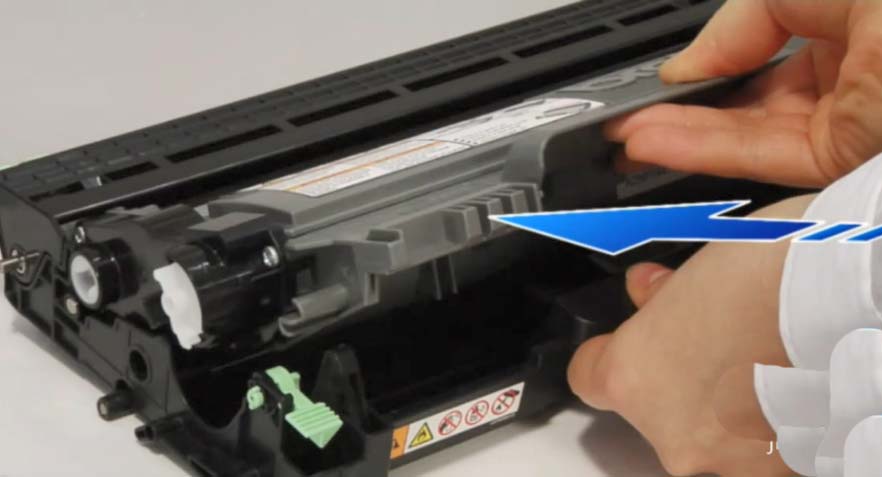 5、打開新墨粉包裝。左右輕輕搖動數(shù)次,使墨粉盒內(nèi)部的墨粉均勻分布。拆下保護蓋。