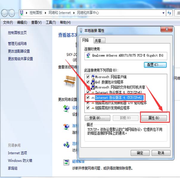 3、點擊屬性按鈕會出現一個本地連接的屬性的彈框,然后選擇Internet協議版本4(TCP/Ipv4),再點擊屬性。