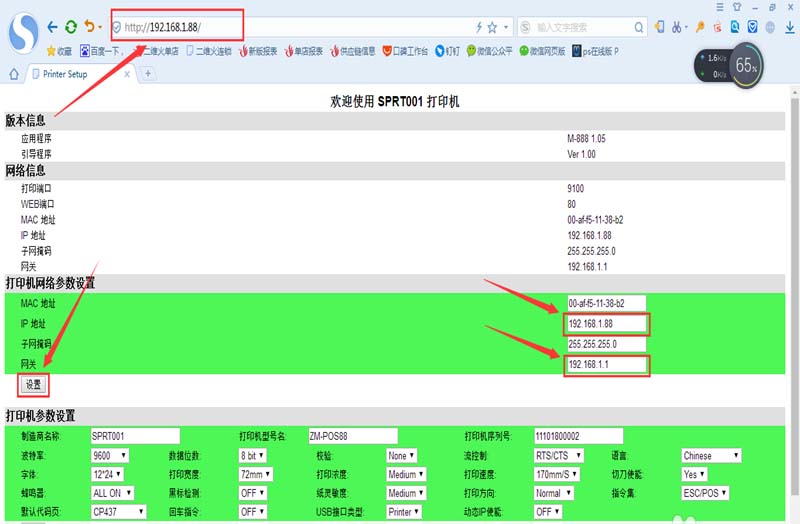 6、打開瀏覽器輸入打印機IP地址,然后在打印機網絡參數設置里將打印機IP和網關改成和店里路由器同一個網段。然后點擊設置即可。