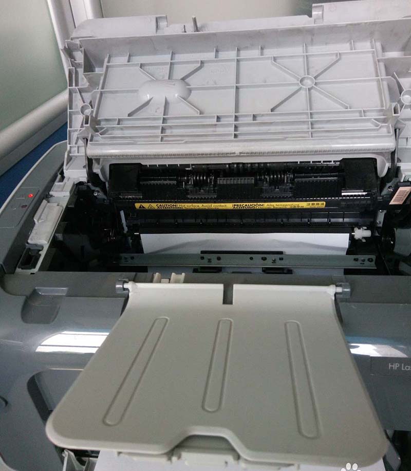 1、一臺HP1106激光打印機進紙1/4位置后就停止,三角嘆號的紅燈亮,首先檢查紙張是否潮濕或有異物,再檢查搓紙輪是否干凈,同時查看進紙器是否有異物。