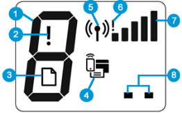 1是控制面板顯示屏。表示份數、紙張錯誤、無線狀態及信號強度、Wi-Fi Direct 狀態和打印頭狀態。