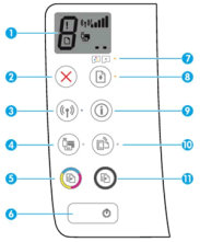 9是信息按鈕。打印一份打印機信息頁。與“無線”按鈕、Wi-Fi Direct 按鈕或 HP ePrint 按鈕配合按下該按鈕,了解與各個按鈕相關的具體幫助頁面。該指示燈表示您可以按下“信息”按鈕,獲取幫助。