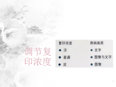 根據原稿紙張、字跡的色調深淺,適當調節復印濃度。原稿紙張顏色較深的,如報紙,應將復印濃度調淺些,字跡淺條細、不十分清晰的,如復印品原稿是鉛筆原稿等,則應將濃度調深些。復印圖片時一般應將濃度調談。
