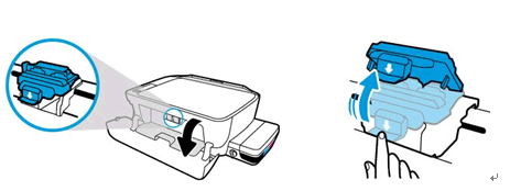 3、開啟惠普連供打印一體機5820打印機后,打開外艙門,然后打開打印頭艙門。把打印頭筆架移動到打印機的中央位置。輕輕地按下藍色打印頭的筆架閂鎖。藍色打印頭的筆架閂鎖將打開。