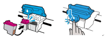 4、滑動新打印頭,讓它稍微向上傾斜,滑入空插槽中,然后輕輕地向上推打印頭,直到它卡合到位。將黑色打印頭插入右側插槽。將三色打印頭插入左側插槽。要合上藍色筆架閂鎖,用力向下按,直至閂鎖卡合到位。(重要提醒: 安裝打印頭后,請勿打開藍色筆架閂鎖,否則會導致嚴重的供墨系統錯誤。)