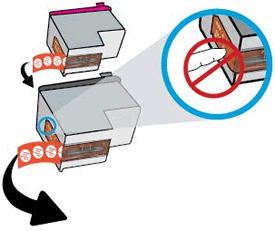 2、用拉片撕下打印頭觸點上的膠帶。(注意:不要觸碰銅色觸點或墨水噴嘴。千萬不能撕下觸點上的保護膠帶。 處理這些部件會導致墨水噴嘴阻塞、不噴墨或者造成電路接觸不良。)