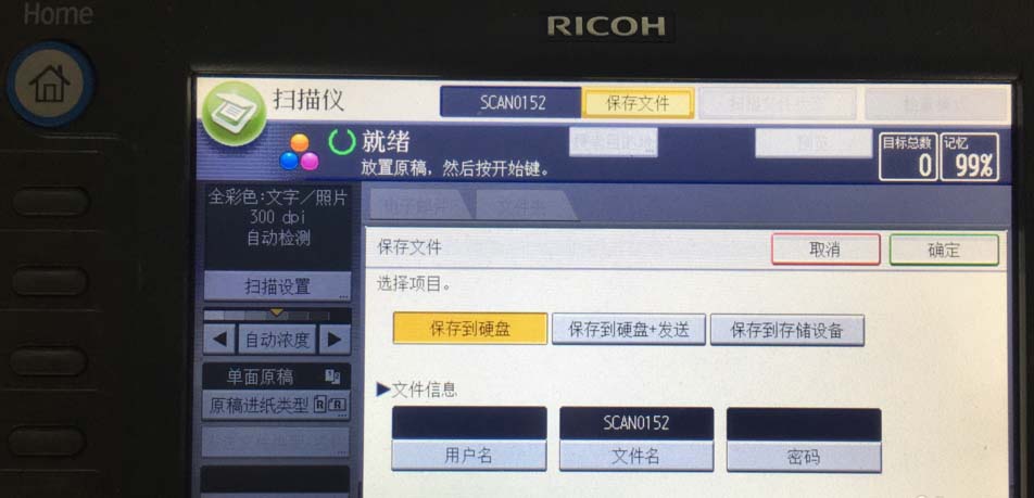 2、設置保存路徑。一體機的情況下,可以采用郵件發送至郵箱的方式,但是這里介紹直接由一體機發送至電腦的形式。點擊右上方的保存文件圖標,設置保存到硬盤。點擊確定。