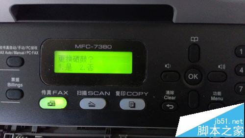 2、按住"OK"鍵直到屏幕出現"更換硒鼓?1)是 2)否",按一次"啟用"鍵,屏幕變為空白。