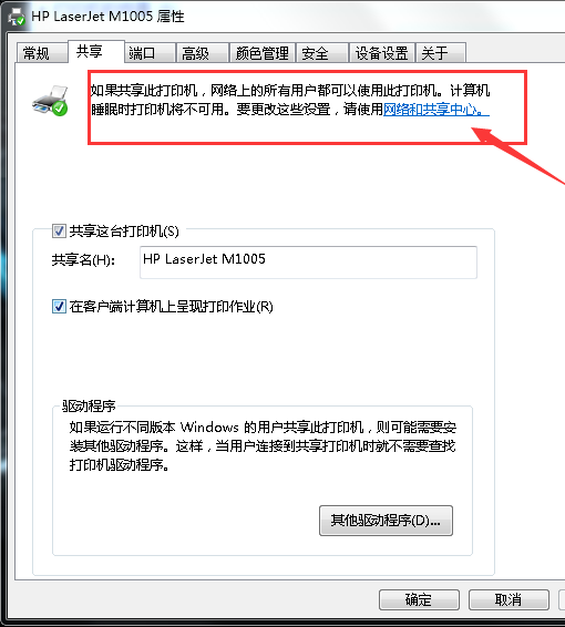 4、啟用網絡發現和打印機共享:在打印機屬性共享面板中找到上面的網絡和共享中心,點擊進入,如圖: