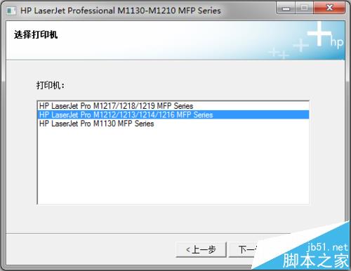 6、選擇打印機,這里以HP LaserJet Pro M1213 MFP Series為例,點擊下一步