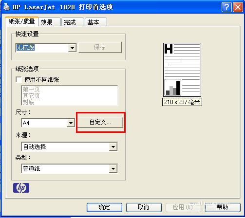 3、在打印首選項窗口中,點擊”紙張/質量“標簽,然后點擊”自定義“按鈕。