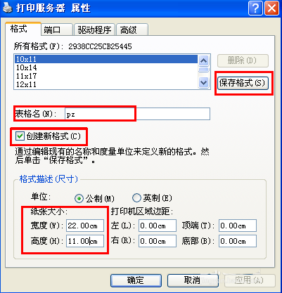 3、在打印機服務器屬性窗口中,選擇“格式”標簽,將“創建新格式”打上勾,然后輸入新格式名稱,在“紙張大小”那里輸入你需要的大小,點擊“保存格式”保存。