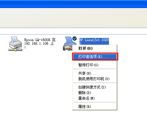 2、右擊要設置紙張大小的驅動程序,選擇”打印首選項“,打開”打印首選項“窗口。