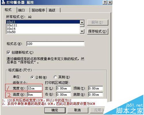 說(shuō)明:選中“創(chuàng)建新格式”,根據(jù)您所用的打印紙,輸入新格式名稱,以及格式的寬度、高度等信息。