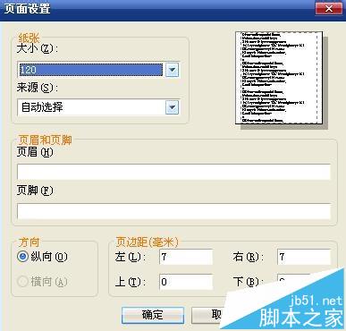 說(shuō)明:將紙張大小改為“120”,清空頁(yè)眉和頁(yè)腳,方向選為縱向,將頁(yè)邊距的“左”、“右”均設(shè)置為7,“上”、“下”清空,然后點(diǎn)“確定”就可以了。
