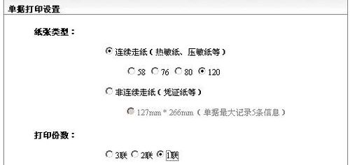 說(shuō)明:選擇“連續(xù)走紙”、“120”、“1聯(lián)”。