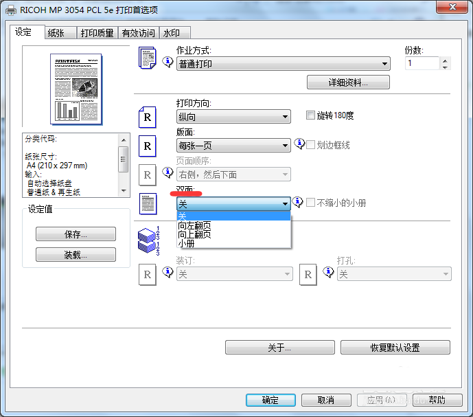 4、默認為雙面,左右翻面的,點開雙面位置會出現關,選關表示單面打印,或者直接選左側的單面,然后點應用,這樣默認打印單面就設置好了,需要打印雙面就在相應的應用程序(如WORD)里面打印的時候在打印機屬性里面去改