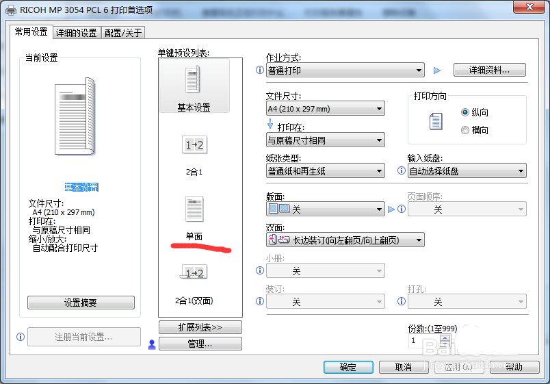 理光打印機MP2554/3054/3554/4054/5054/6054系列如何設置默認單面打印的方法,以MP3054為例