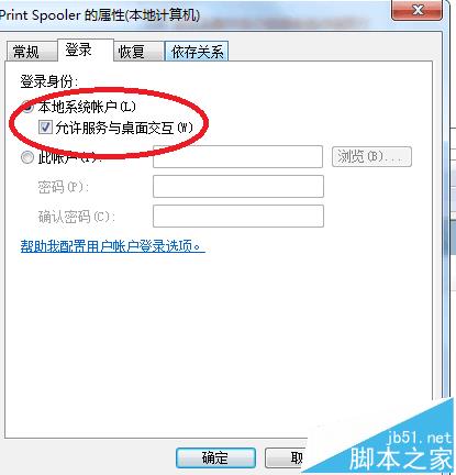 4、取消 Print Spooler服務屬性里“允許服務與桌面交互”前邊的對勾:在“開始”——“運行”里輸入“services.msc”(不含引號),打開服務管理器, 找到Print Spooler這一項,雙擊它,然后切換到“登陸”選項卡,去掉“允許服務與桌面交互”前邊的對勾