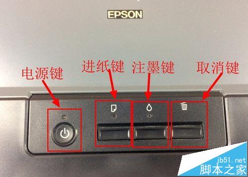 2、正面上突出的就是控制鍵部分,分別是電源鍵、進紙鍵、注墨鍵和取消鍵。保持了愛普生一貫的簡潔設計。