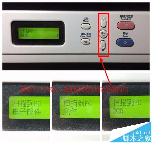 2、如何進行掃描:按“掃描”鍵,液晶屏提示“通過上下鍵選擇掃描到PC”,按“ok”鍵,進入下一步,提示“掃描到PC”,通過上下鍵可以選擇四個選項,分別為圖像、電子郵件、文件和OCR,我們選擇圖像,按“ok”鍵。