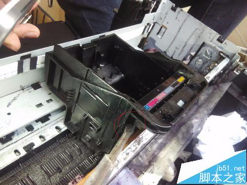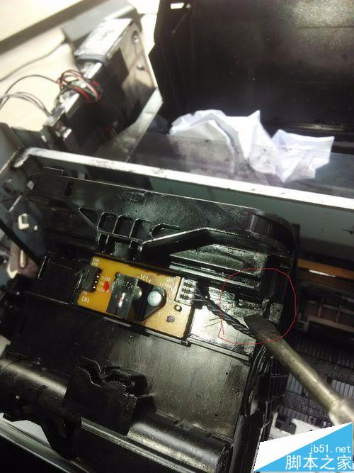 1、墨盒接觸板的后面有卡扣,改刀所指的位置,將卡扣按進去后,墨盒接觸板才能取下,最后噴頭就好取了。。。