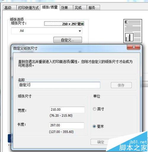 3、如果不行,可以嘗試修改左方的”紙張大小“為合適的大小,或者點擊”自定義“手動指定大小,試試能否打印。