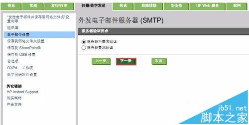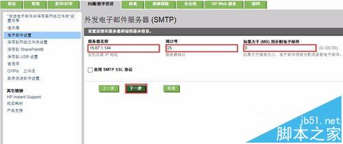 5、服務(wù)器名稱會顯示出剛才填入的,端口號一般默認(rèn)是25,如果大于則分割電子郵件,建議選成0,如果此位置輸入其他值,可能導(dǎo)致比較大的文檔掃描不到電子郵件中,點擊下一步。
