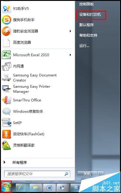 1)點擊電腦左下角的【開始】,再選擇【設備和打印機】。(Windows 8系統和Windows 10點擊菜單快捷鍵【Win】+【X】組合鍵-【控制面板】-【查看設備和打印機】)。這里以【Windows 7】系統為例。