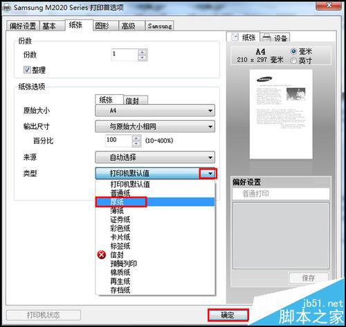 4)點擊【紙張】,然后將紙張類型設置為【厚紙】,再按【確定】。