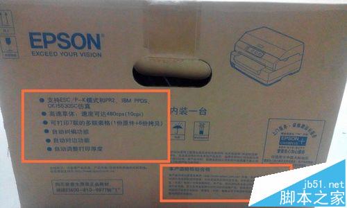 2、包裝上有自動糾偏、自動對邊、打印速度480cps(10cpi),支持ESC/P-K模式、自動調整打印厚度等功能介紹、檢驗合格聲明,還有能效標識,1級,純綠色。