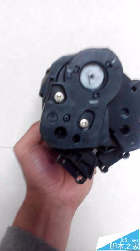 1、打開打印機取出硒鼓,對硒鼓進行拆解,如圖 ,hpm1005用的 就是這個硒鼓,首先在側(cè)邊擰開兩顆螺絲,打開卡扣蓋子,如圖