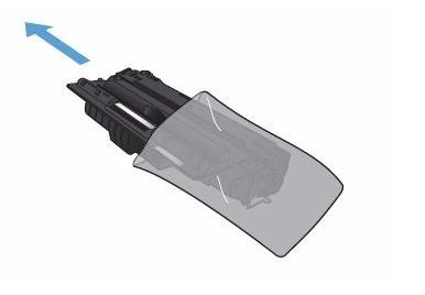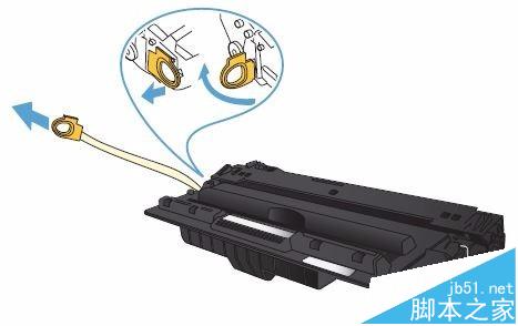 5、撕下密封膠帶。彎曲碳粉盒左側的壓片,直至壓片變松。向外拉壓片,直到將整條膠帶從打印碳粉盒中拉出。將壓片和膠帶放在碳粉盒包裝盒中,以便回收利用。