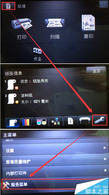 3、先按紅色X鍵取消裝紙,將紙張完全退出送紙通道,關閉卷筒護蓋。按以下操作進入服務菜單,執行單張紙傳感器校準:
