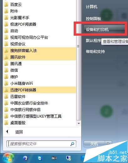 2、在【開始】菜單打開【設備和打印機】