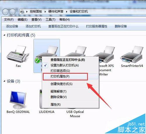 3、【右擊】打印機,選擇【打印機屬性】