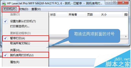 3)我們可以在驅動圖標上右鍵——查看正在打印的內容——在隊列上右鍵取消所有文檔,點擊左上角打印機三個字,取消暫停打印以及脫機打印前面的對鉤。