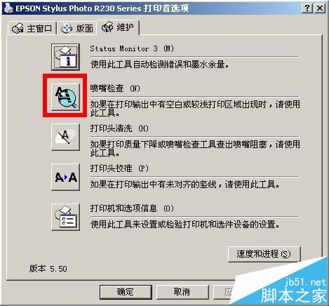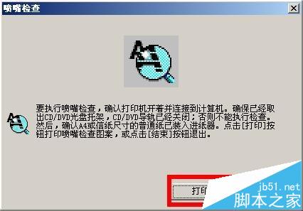 5、這時(shí)候會(huì)彈出下圖所示的界面,我們點(diǎn)擊下圖紅框所示位置,打印噴嘴檢測(cè)圖案,用以檢測(cè)噴嘴堵頭情況,并作為清洗噴頭后的對(duì)比;