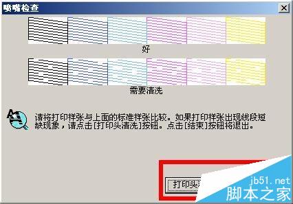 7、等打印出檢測(cè)圖案,然后對(duì)照?qǐng)D案根據(jù)需要點(diǎn)擊清洗打印頭;