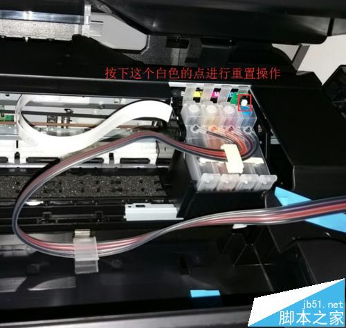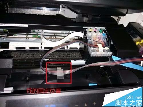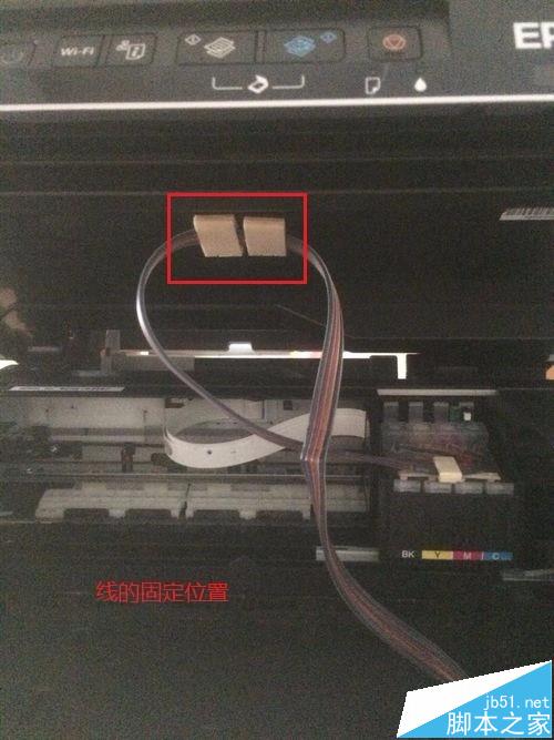 2、安裝打印機連供系統。打開打印機電源,按一下打印機最右邊的那個墨滴鍵,墨車會到更換墨盒位置,把墨盒裝進去,裝的時候用力摁到位,聽到墨盒咔的聲音,把管子固定在打印機上,已經粘好了位置,直接卡上