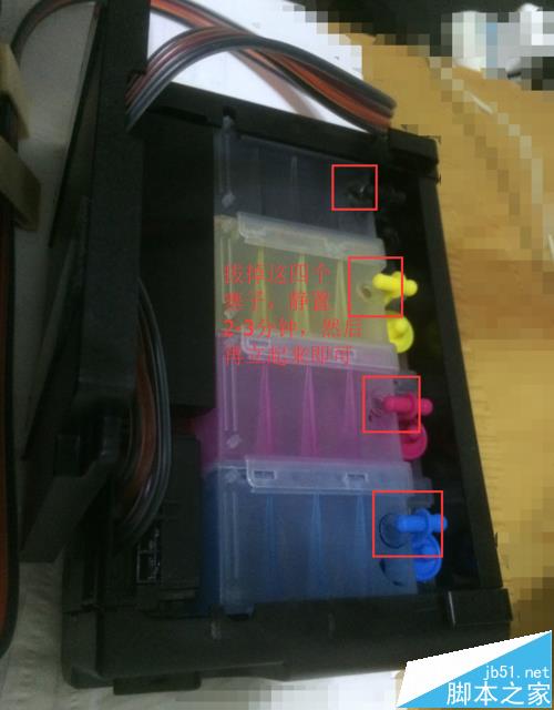 3、連供恒壓處理,將連供躺著,膠塞全部拔掉,放1-2分鐘,看到下面大口倉墨水快溢出塞好大塞子,然后立起,小孔一直打開需要透氣,把側邊的黑色開關指向OPEN。