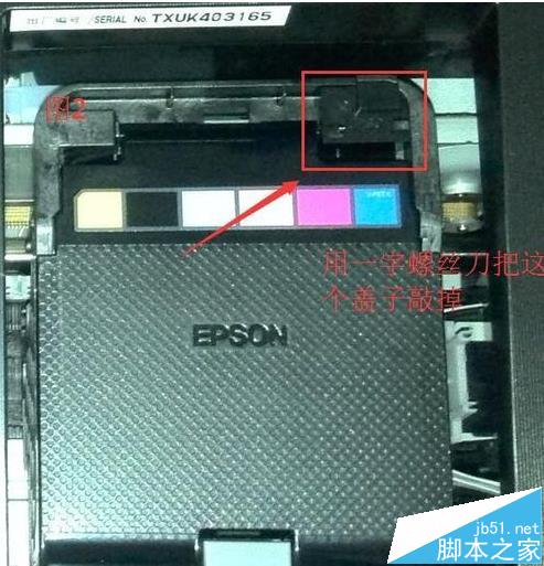 1、開機,按墨水鍵如圖(打印機左側有水滴標志的鍵),把墨盒移動到右側換墨口如圖所示,然后從電源處直接斷電(不能按關機鍵關機,這樣的話,墨盒就會跑動),然后用平口螺絲刀在墨盒右上方的小蓋子上,把蓋子撬開,如下圖2所示,蓋子敲掉以后,保護墨盒的這個蓋子都可以收藏了(沒有用了)。然后把原裝墨盒全部取出來.