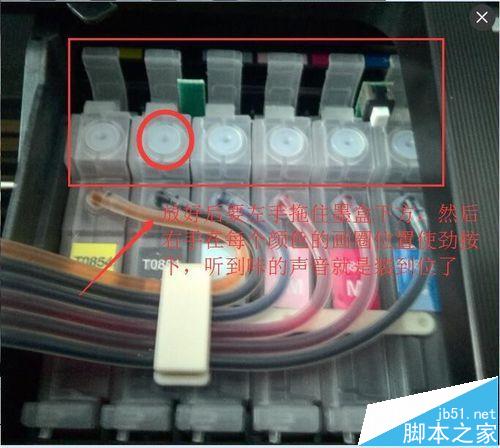 2、然后把連供墨盒整個放進去,這個時候要注意,放進去后,一定要把墨盒摁緊,如圖所示,左手扶著墨盒倉底部,右手使勁按畫圓的地方,直到聽到咔的聲音,說明安裝到位,然后逐個安裝到位。然后開機,等1分鐘后會出現,墨水燈顯示紅燈。說明打印機不認墨盒。