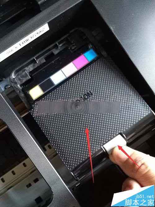 6、輕輕用力往里,推動墨倉蓋子的卡扣,然后往上翻蓋子