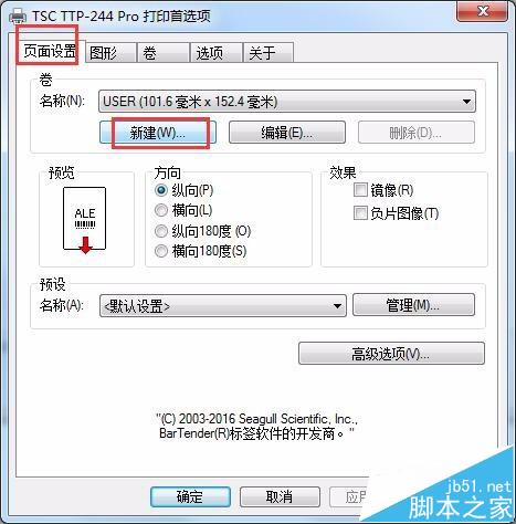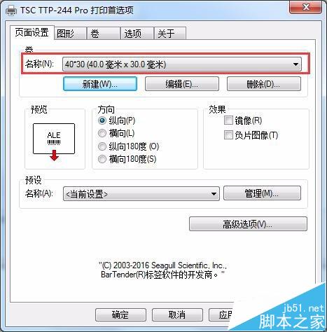 6、彈出的打印機首選項窗口下,選“頁面設置”-卷名稱:選擇跟實際標簽尺寸一樣的尺寸,如果沒有的話,就點“新建”
