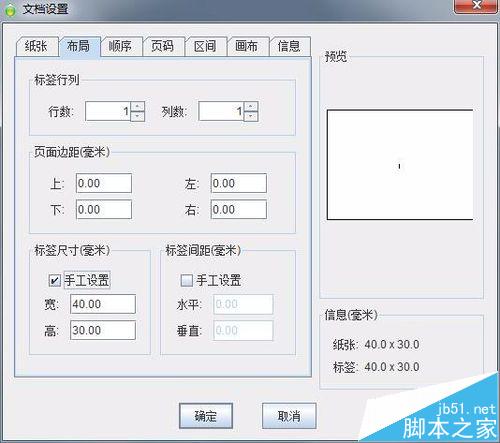 3、再選中“布局”選項卡,輸入1行1列;頁邊距:上下左右都輸入0;勾選"手工設置標簽尺寸",輸入單個標簽的尺寸為:40*30mm。確定后就得到跟實際標簽尺寸一樣的模板。就可以在里面添加條碼,文字 ,圖片,二維碼等內容了。