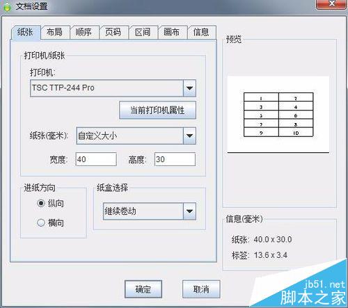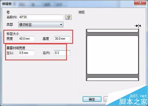 7、在編輯卷窗口下,輸入實際的標簽尺寸40*30mm ,以及標簽底襯左右邊距露出來的距離。設置好后確定,并在打印機首選項中選中該標簽尺寸。在打印試試