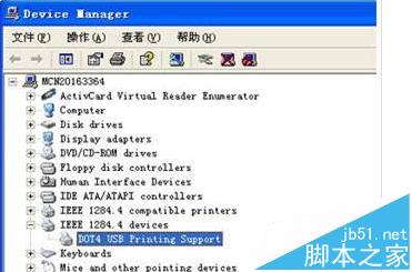 3、右擊“我的電腦”》設備管理器”,此時,你可能需要“查找》顯示隱藏設備”,等2秒后然后“操作》掃描檢測硬件改動”找到DOT4 USB Printer Support。(如下圖所示)