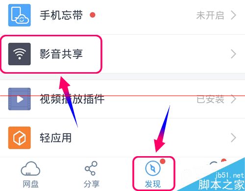 2、連接小度WiFi可以選擇百度視頻或者百度云,我這選擇百度云,打開登錄百度云,點擊[發現]找到并打開[影音共享]